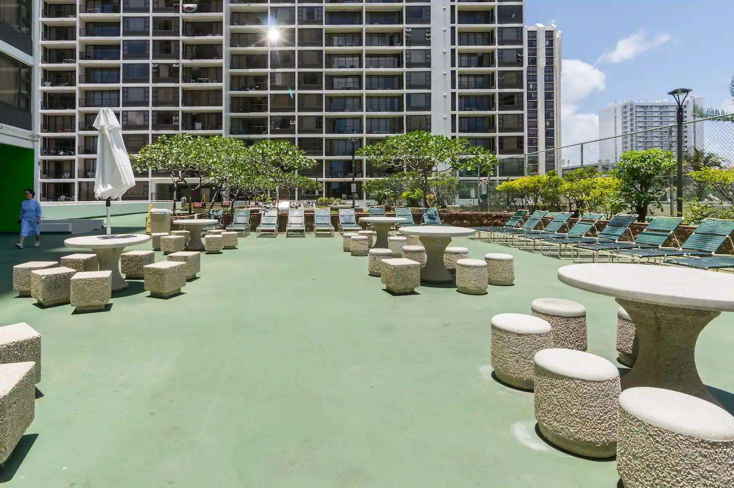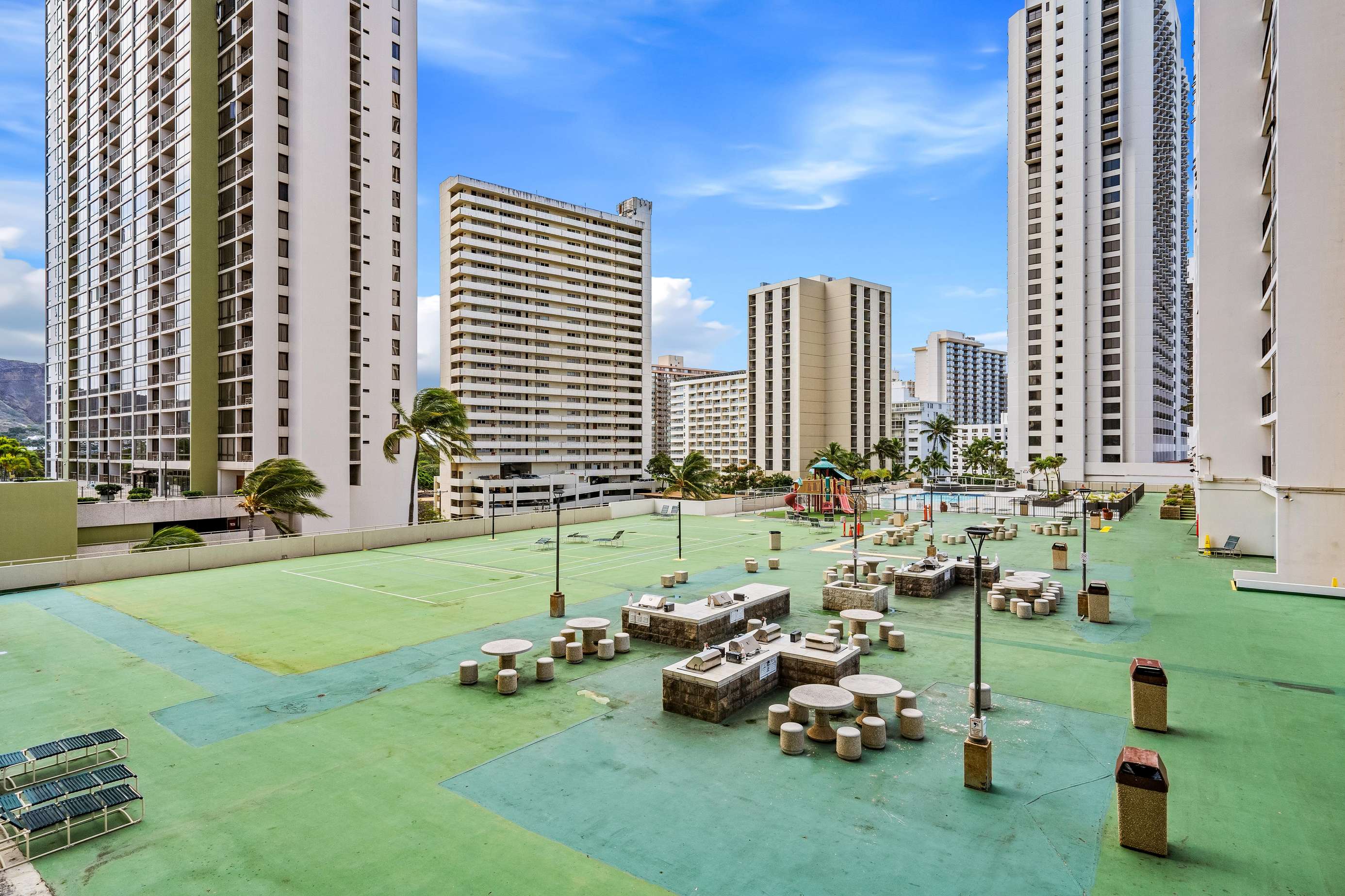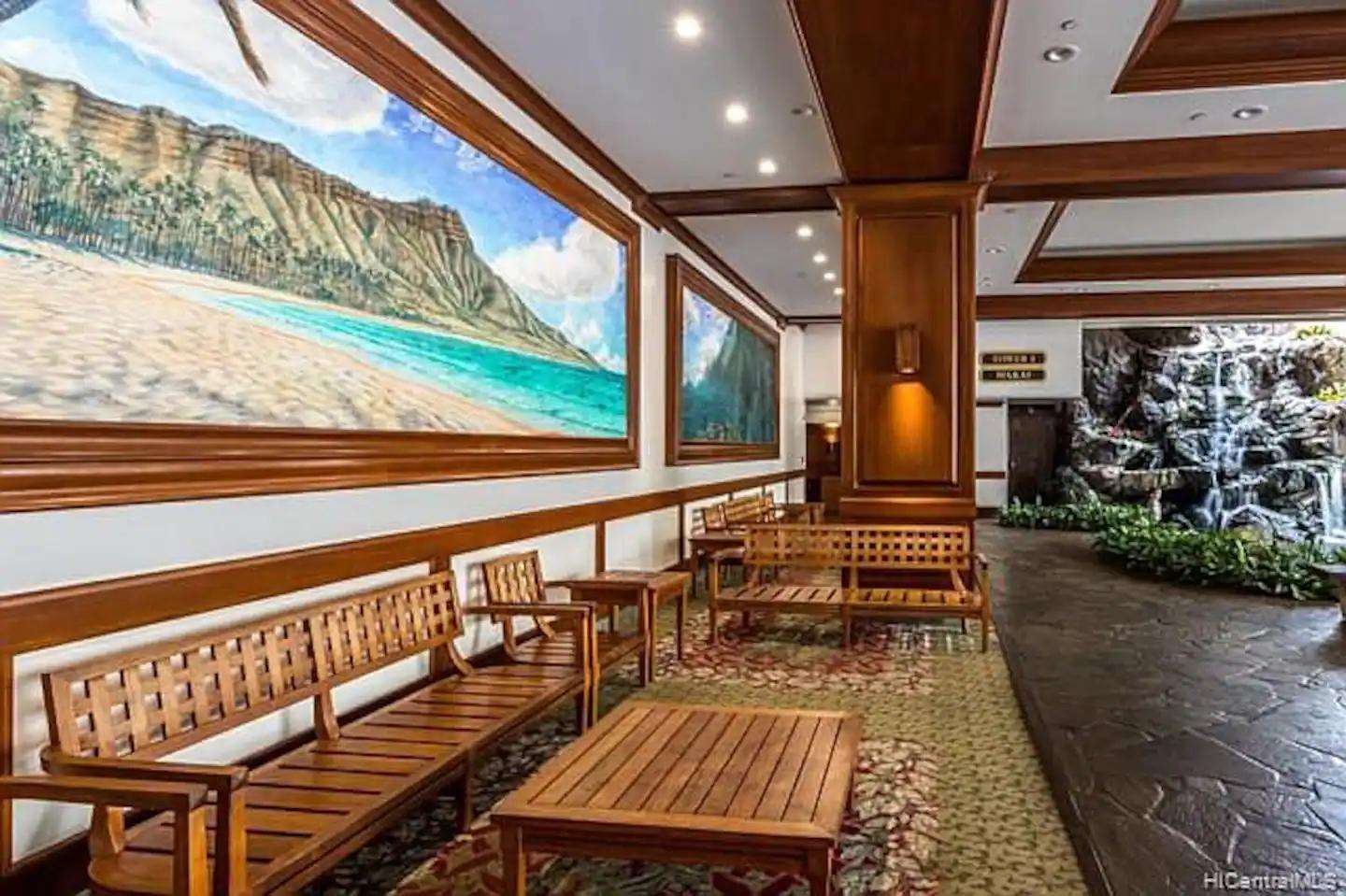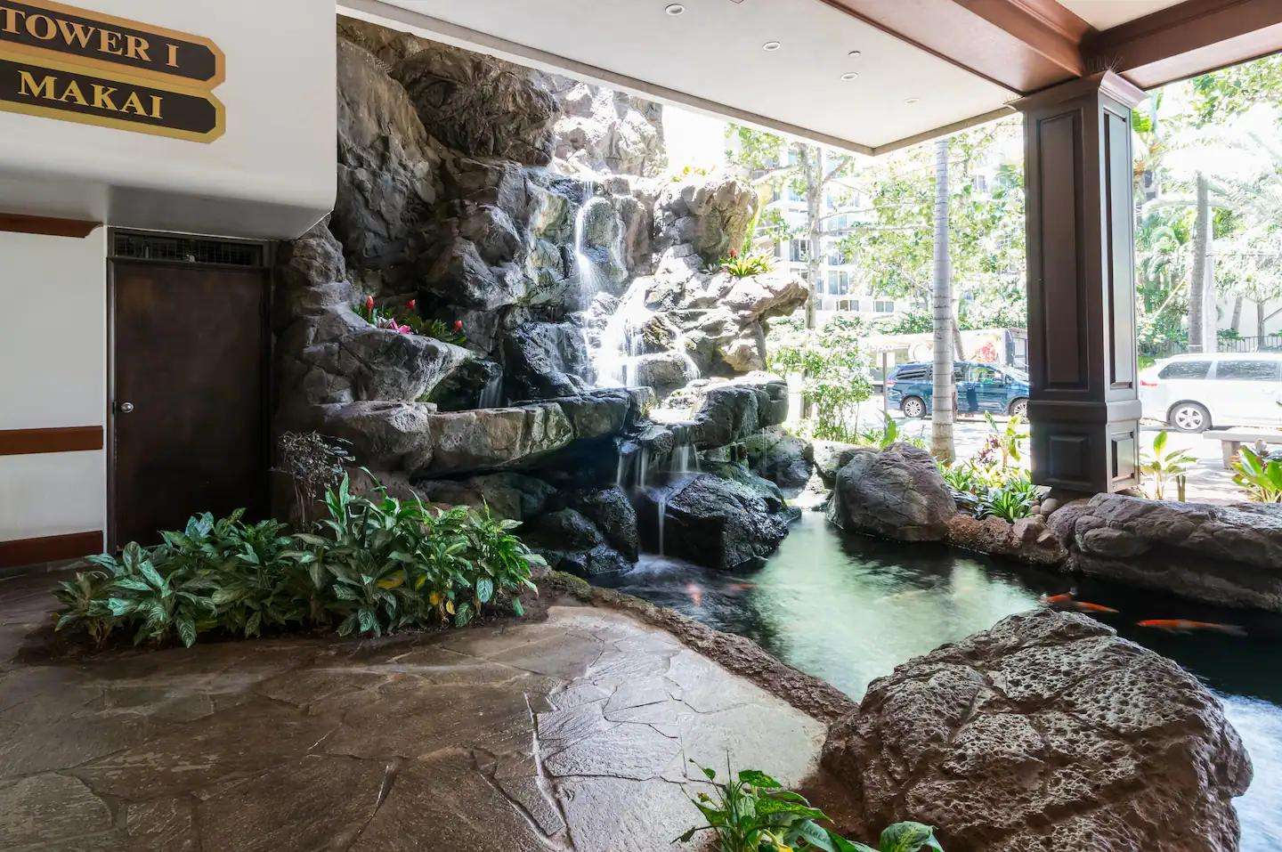 Complete with a tropical waterfall and koi pond, the upscale lobby will welcome you to one of Waikiki's most popular condo resorts. The recreation deck on the 6th floor is equipped with a swimming pool, two hot tubs, kids play equipment, tennis court, basketball court, barbeque grills, picnic tables, sauna, lounge chairs, and mini restaurant. The Banyan Breeze coffee shop is located on the 1st floor. 24 hour security is there to help you rest easy.