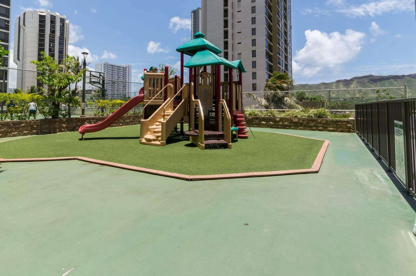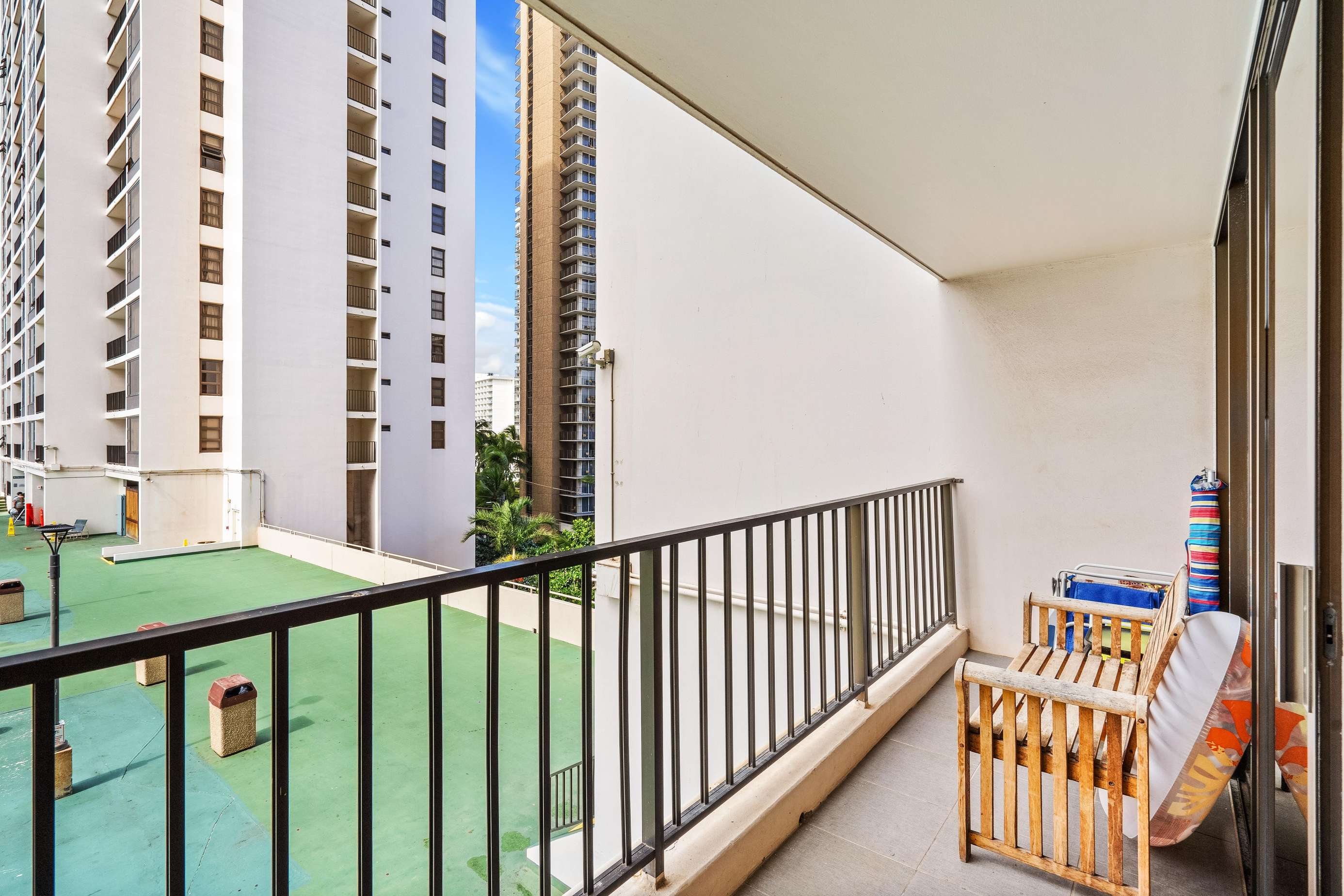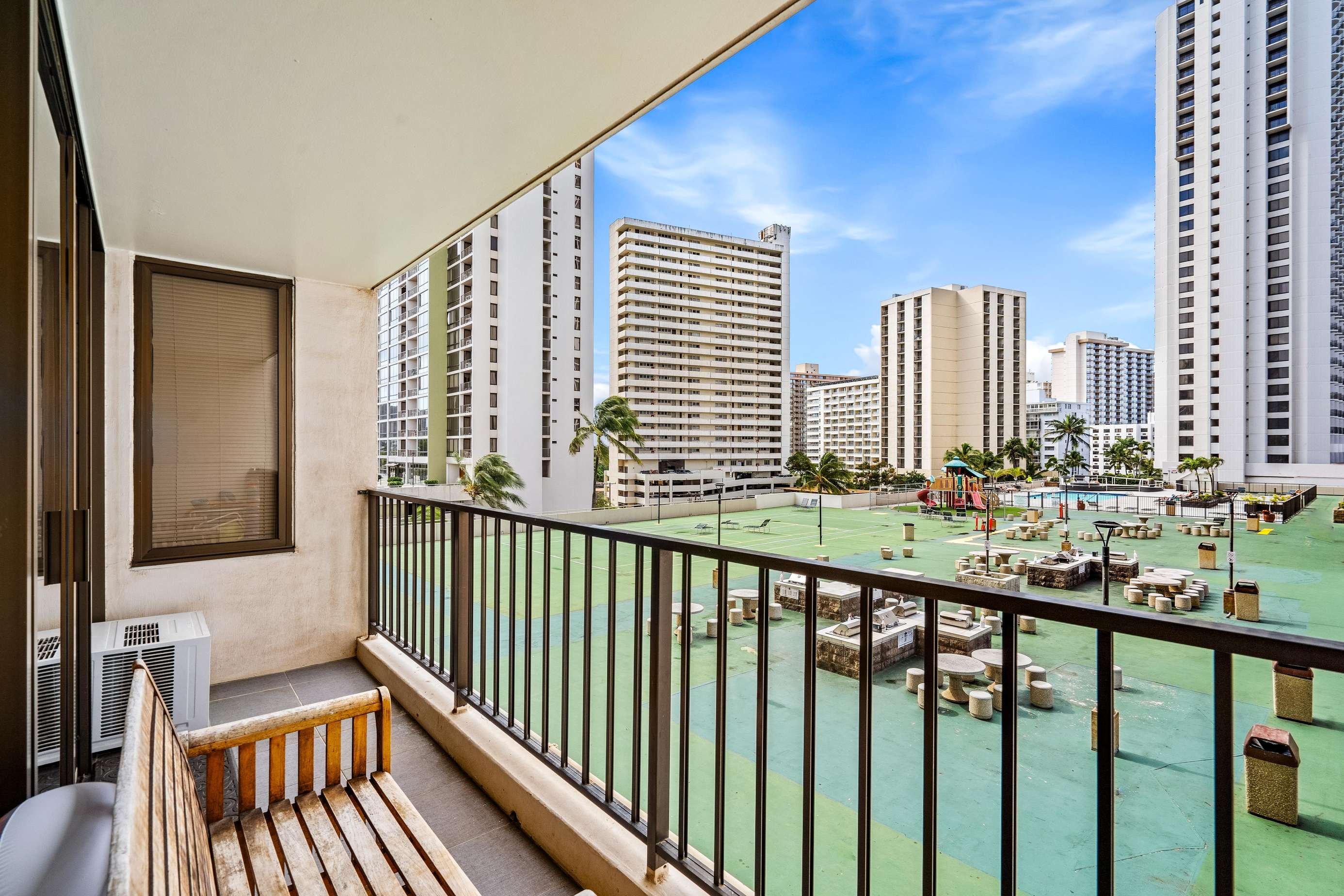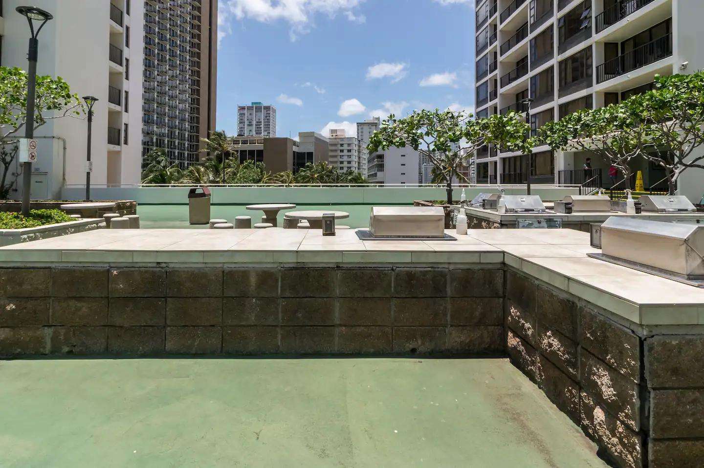 Complete with a tropical waterfall and koi pond, the upscale lobby will welcome you to one of Waikiki's most popular condo resorts. The recreation deck on the 6th floor is equipped with a swimming pool, two hot tubs, kids play equipment, tennis court, basketball court, barbeque grills, picnic tables, sauna, lounge chairs, and mini restaurant. The Banyan Breeze coffee shop is located on the 1st floor. 24 hour security is there to help you rest easy.