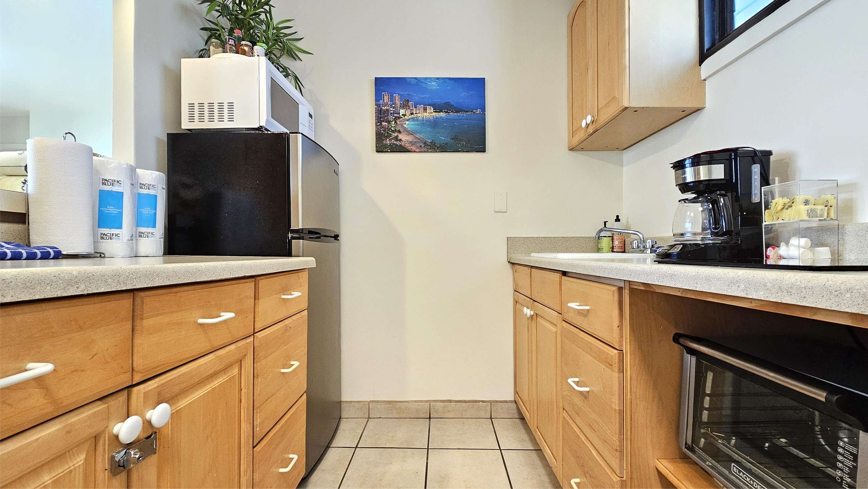 Suite 422 is a great remodel queen bed Waikiki studio with kitchen, bathroom and shower. A great location on the park and just steps from the beach. The kitchen area has fridge, stovetop and microwave, toaster, Coffee maker, towels & dishware.