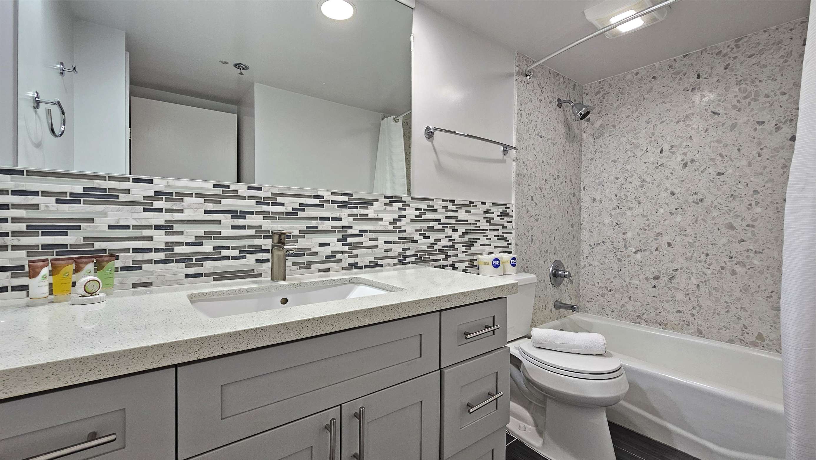 Bright and super clean, modern Bathroom with Shower tub combo.
